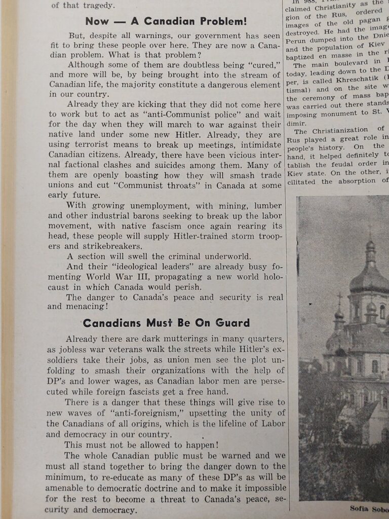 Already, they are using terrorist means to break up meetings, intimidate Canadian citizens…Many of them are openly boasting about how they will smash trade unions and cut “Communist throats” at some early future. (The Ukrainian Canadian, April 1, 1948)