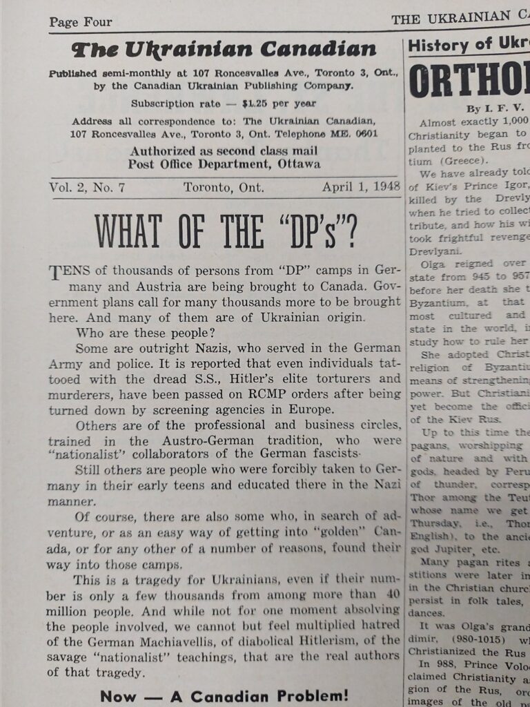 Canadian authorities let these nazis in because they were “anti-communist”. A newspaper from the Canadian Ukrainian in 1948 makes the following point. That Some of the Ukrainians coming were “outright nazis”.